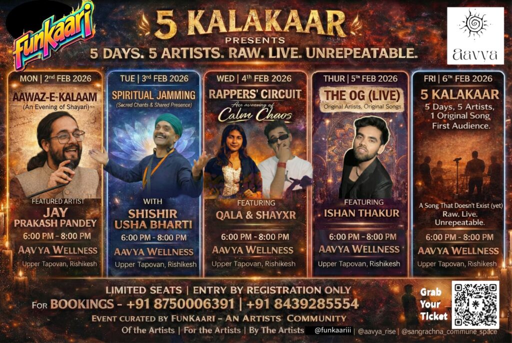 Each evening from 6–8 PM, Aavya becomes a space for different art forms — poetry, kirtan, rap, and original songwriting.